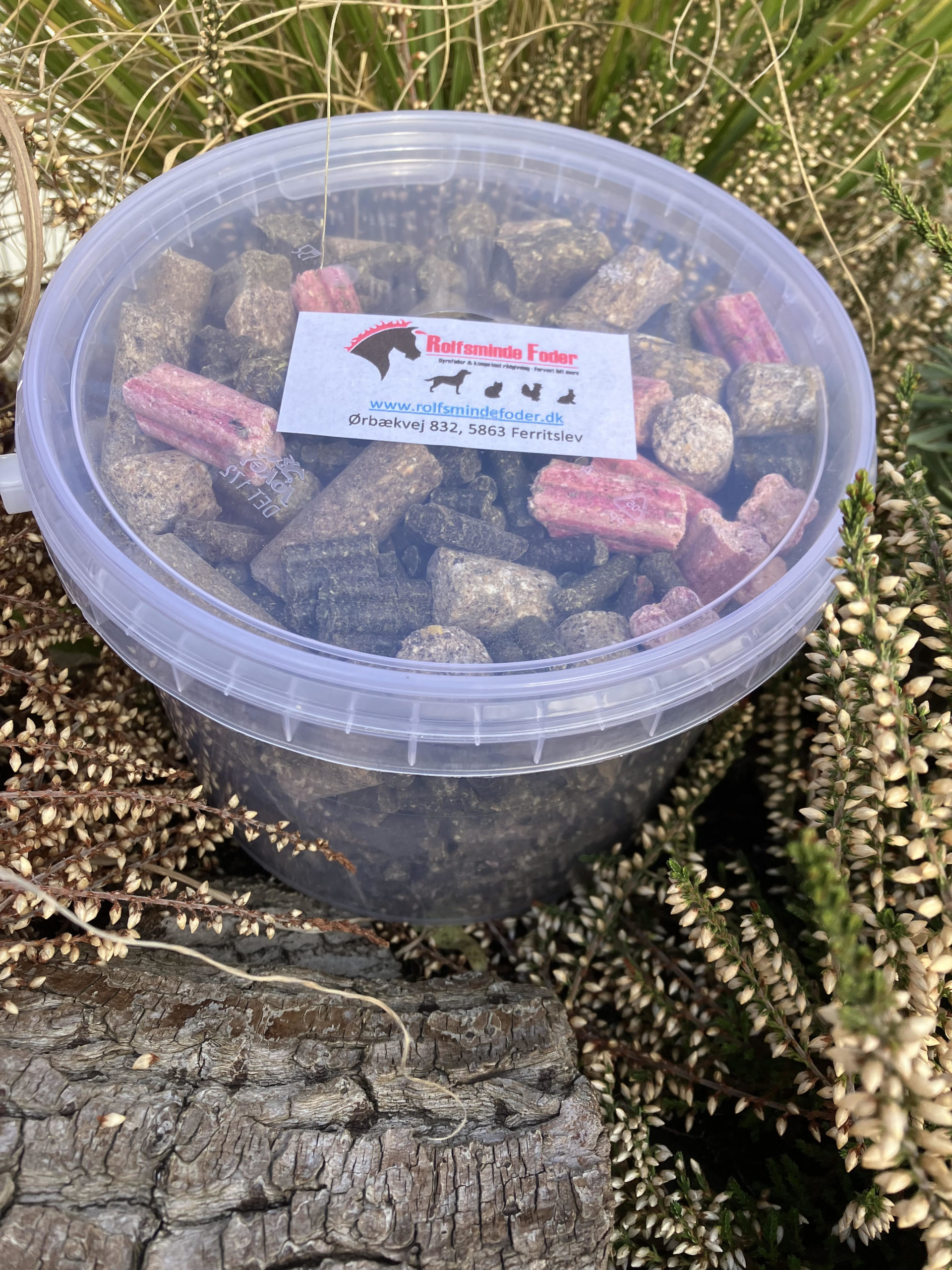 Håndblandet godteblanding fra Rolfsminde Foder – ingen spande er ens! Indeholder ca. 9 forskellige hestegodbidder i både store og små stykker, med smage som æble, gulerod, lakrids, urter, lucerne og tiny treats. Ca. 1–1,5 kg ren forkælelse.