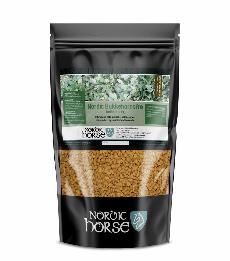6 gr. bukkehornsfrø pr. 100 kg kropsvægt pr. dag.
