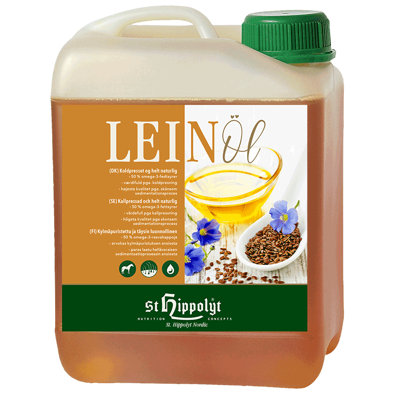 5-25 ml pr. 100 kg kropsvægt dagligt sammen med det daglige foder. Hørfrøolien indfodres langsomt over 3 uger til ønsket daglig tildeling er opnået. Ved højt arbejdsniveau kan tildeles op til 200 g råfedt i den daglige ration. Sedimentation kan forekomme og er ikke en kvalitetsmangel. Dunken/flasken rystes godt før brug for at fordele eventuelle svævestoffer.