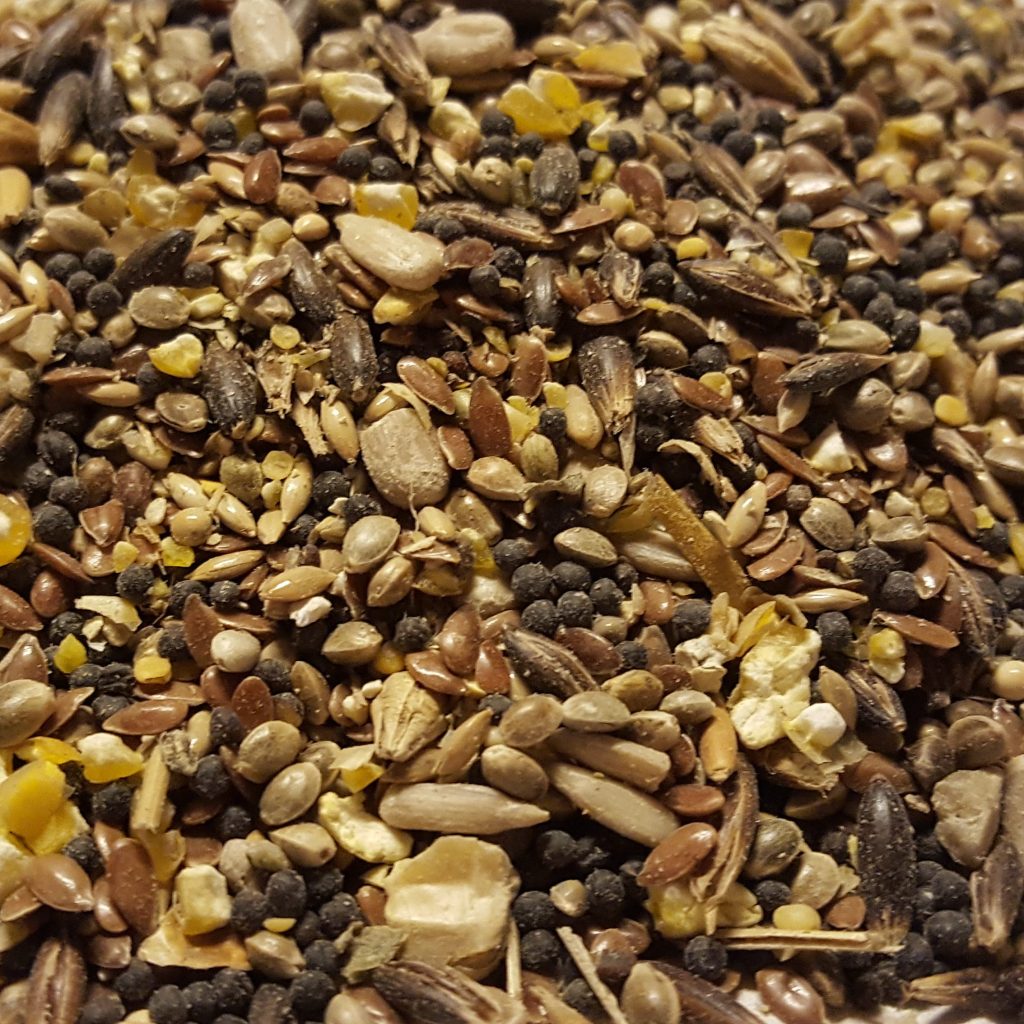 Ærter, Majs, Hampefrø, boghvede, Hør, Raps, Afskallet solsikke, Kanariefrø,